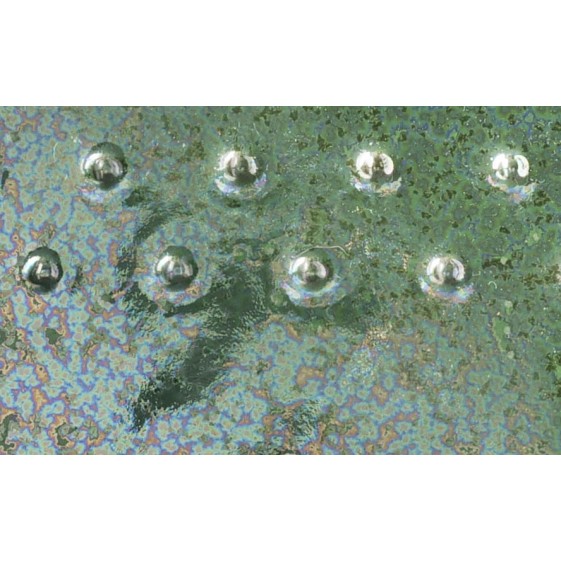 June Bug is a glossy, dark green metallic glaze that develops small triangular iridescent crystals, like the wings of a beetle.