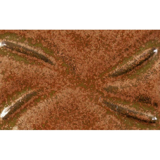 Inspired by classic tomato red reduction glazes, Ancient Copper is an iridescent, iron red glaze that breaks dark brown over texture and pools dark yellow-green, giving it a weathered appearance.